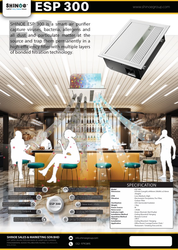 SHINOE ESP 300 is a smart air purifier capture viruses, bacteria, allergens and all dust and particulate matter at the source and trap them permanently in a high-efficiency filter with multiple layers of bonded filtration technology.