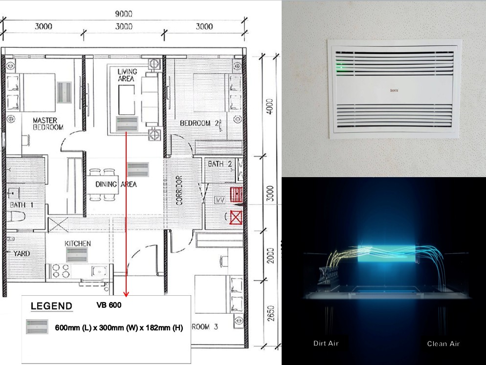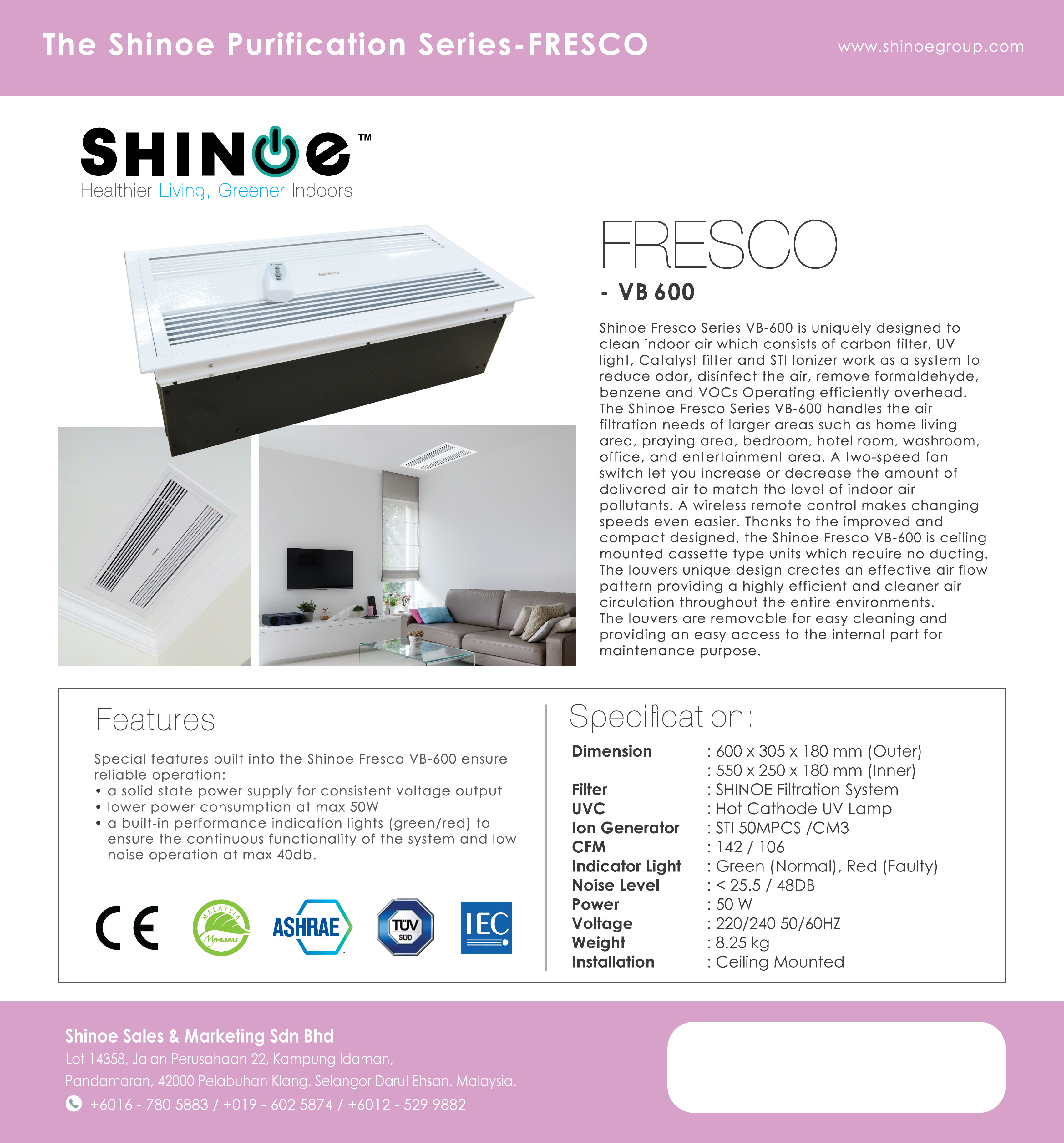 Shinoe Fresco Series VB-600 is uniquely designed to clean indoor air which consists of carbon filter, UV light, Catalyst filter and STI Ionizer work as a system to reduce odor, disinfect the air, remove formaldehyde, benzene and VOC's Operating efficiently overhead.